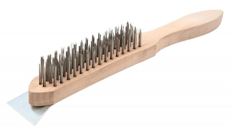 Beorol drótkefe lehúzóval a nagyobb és keményebb szennyeződés vagy rozsda eltávolítására. Fa markolat, rugalmas acél drót sörték, 4 sorosan